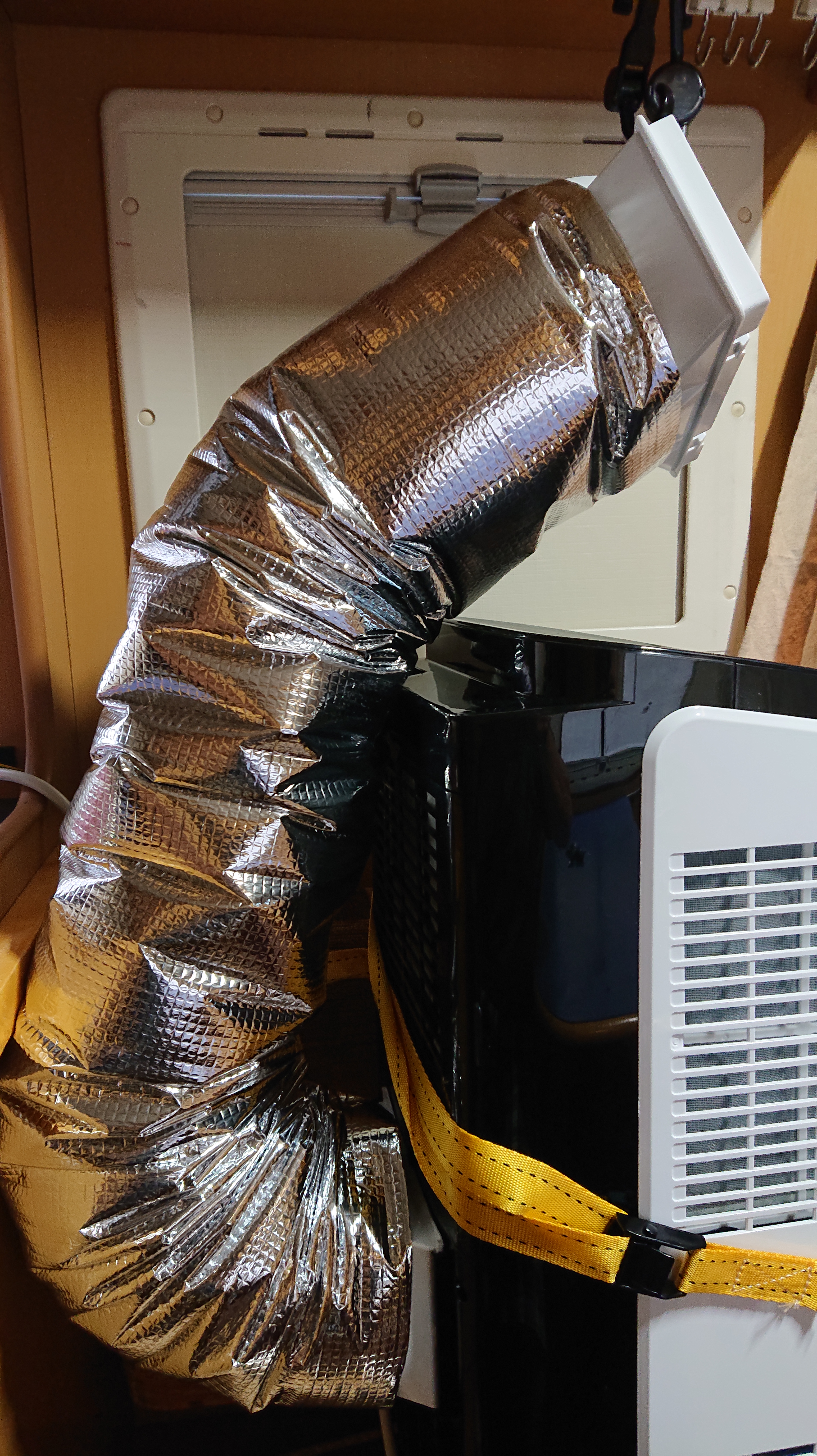 Up主は、キャブコンにアイリスオーヤマのポータブルエアコンを設置している。6月19日の車中泊での試運転動画でお気づきの方もいるだろう。室温が低下したにもかかわらず、エアコンが一晩中、一定の風量で作動していたのだ。試運転中、プラスチック製の排気ダクトに手を近づけると、体感50度位に熱くなっていた。排気ダクトの熱が室内にも放熱されていたのだ。ダクトが室内機の吸入口に近いため、室温が設定温度まで到達していないとエアコンが判断したのだろう。対応策をネットでググった末、ダクトに遮熱材を巻き付けることにした。蛇腹ダクトが自在に湾曲できるように両面テープで固定。部材の冷保温シートは千円也。近々、改善効果を検証する。