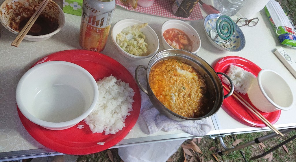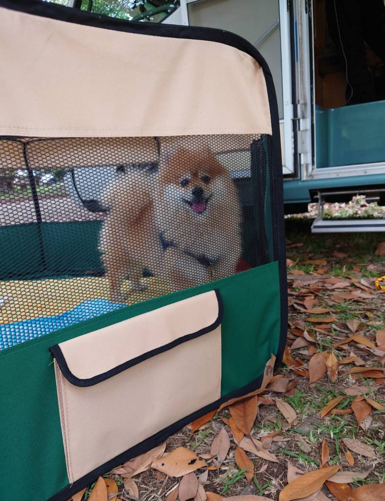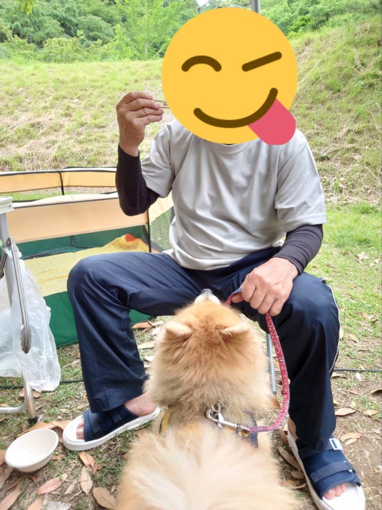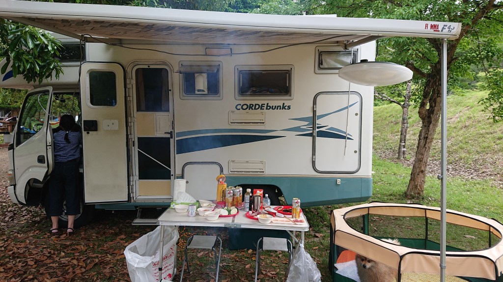 くにみオートキャンプの犬連れ車中泊旅で味を覚えたup主は、ペペ号を県南の「うめキャンプ村」に走らせた。モチ電源付き・ペット同伴可のオートキャンプ場だ!up主は午前中、急遽電工の仕事が入ったため、自宅を午後出発。途中、三重のモール街で食材を買い込む。食材選びは今回気合いの入った妻におまかせ。チェックインは16時。11m四方のオートサイトで両隣は利用者なし。キャブコンで来ているのは我々のみ。普通車が多く皆テントとタープを張っている。既にバイク旅のグループが芝生に一人用テントを張り談笑中。up主は、ペペがバイク乗りに吠えまくらないか横目に、そそくさと設営準備。此度のミッションは、トングを忘れずに持って行く、ペペ用サークルの設置、〆に辛ラーメンを追加、の3点!以下ご覧のとおり!