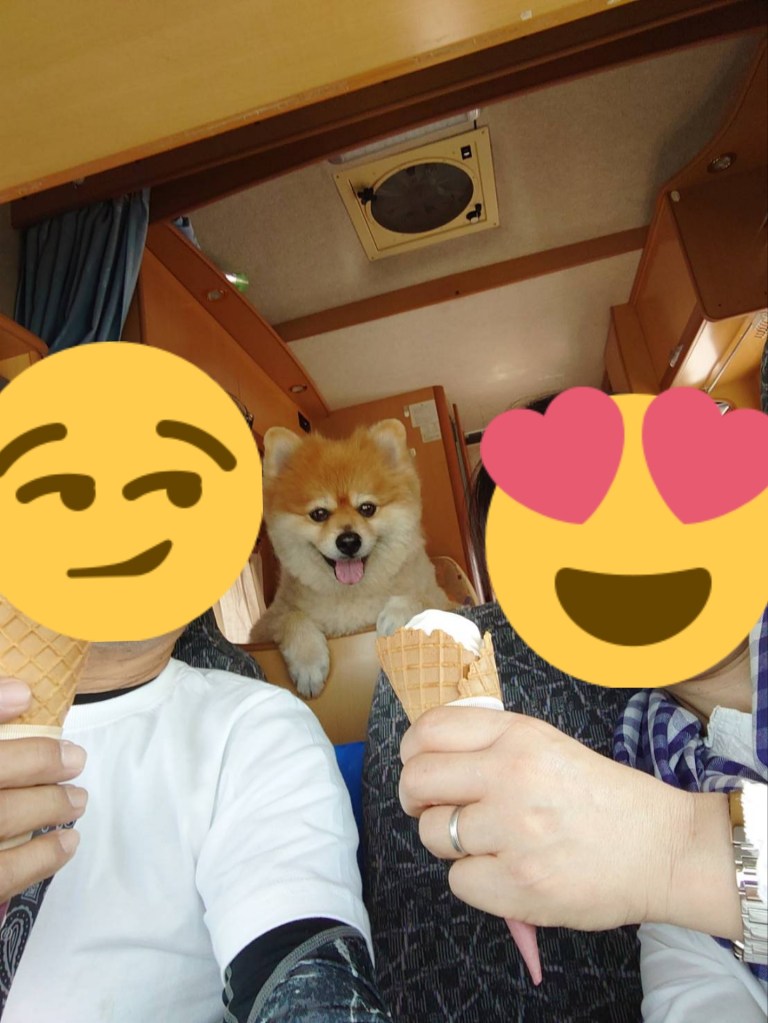 帰りの高速道路のサービスエリアでUp主はソフトクリーム!それを見つめる、じっと我慢のペペ!